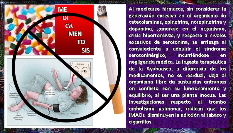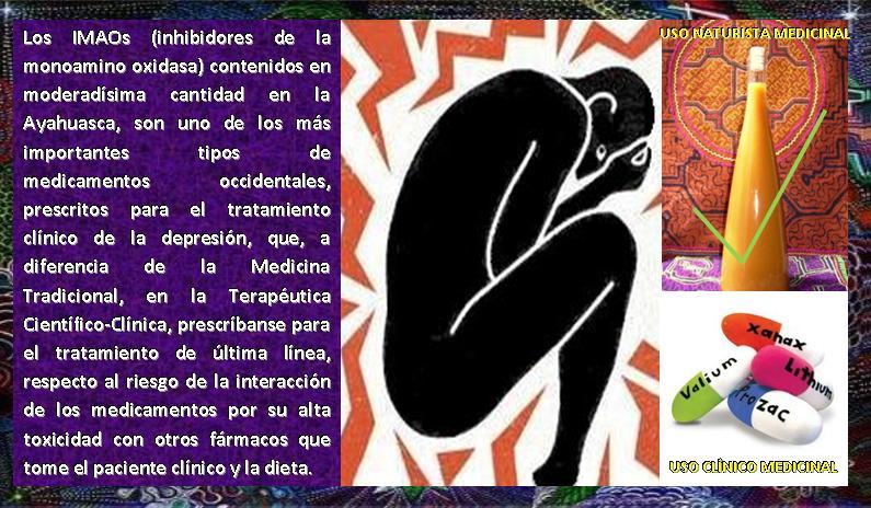 La presencia minúscula de los IMAOs, en el preparado tradicional de la Ayahuasca (comprobado científicamente en el siglo XX), era utilizada modernamente como antidepresivo eficaz en el campo de la psiquiatría, mas requiriere su ingesta en varias sesiones (uso progresivo en el tiempo) para que los pacientes marcadamente deprimidos experimenten efectos antidepresivos significativos.